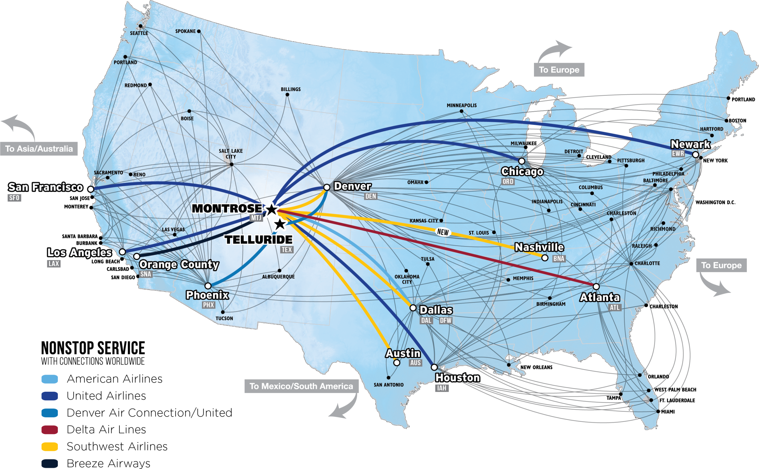 This winter, enjoy direct flights from 13 major U.S. hubs on six airlines, including new service from Nashville to Montrose on Southwest and continued service to Los Angeles on United and Orange County on Breeze. Take advantage of daily flights from Atlanta, Chicago, Denver, Dallas (DFW and DAL), Houston and New York to Montrose (MTJ) from December to late March/early April. Austin also offers Saturday flights to Montrose, Los Angeles offers flights 5x weekly to Montrose, and San Francisco has flights Sat-Sun weekly plus additional flights during the holidays. Phoenix also has daily flights year-round (Thursdays through Sundays in November and April) direct to Telluride Regional Airport (TEX) on Denver Air Connection. Denver Air also offers year-round service from Denver to Telluride (TEX). Plus, new in 2025-26, Southwest will be flying direct from Nashville on Saturdays in March.