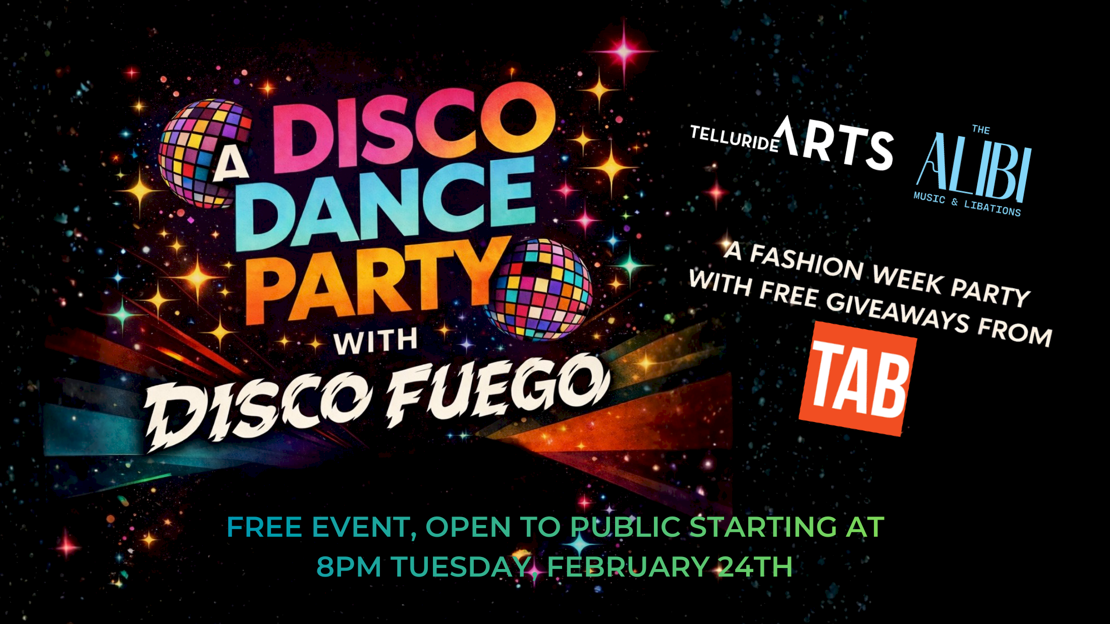 Get ready to light up the dance floor - Telluride Arts, TAB, and The Alibi present "A Disco Dance Party with Disco Fuego"! Join them for a high-energy Fashion Week celebration packed with glitter, groove, and vibrant disco flair. Enjoy free giveaways from TAB while you move to the irresistible sounds of Disco Fuego in a full-on cosmic disco atmosphere. This is a free event and open to the public. Festivities begin at 8 PM on Tuesday, February 24th at The Alibi. Expect dazzling lights, bold beats, and a night full of fashion-forward fun. Don’t miss it!