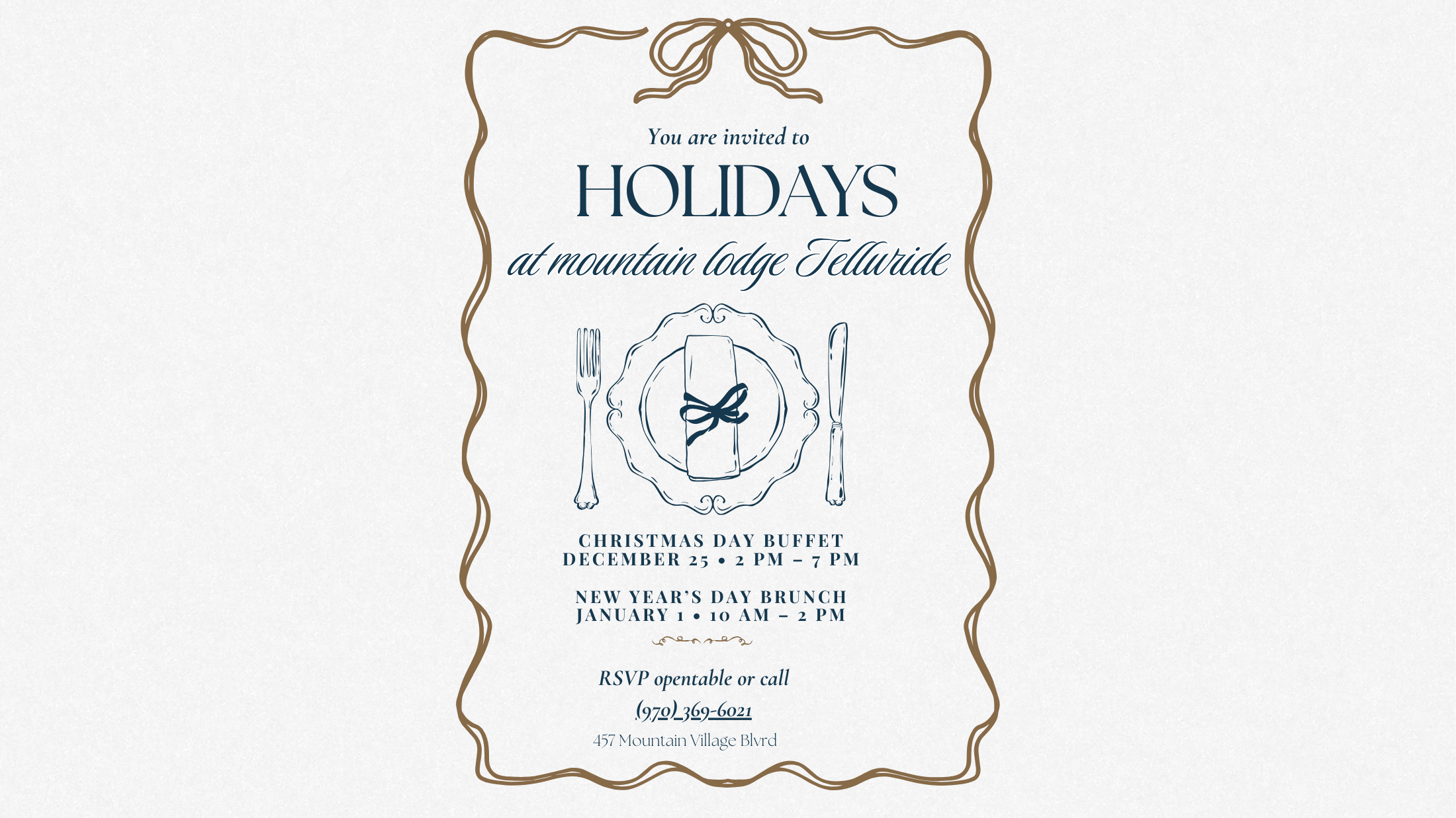 Celebrate Christmas with us at Mountain Lodge's Christmas Day Buffet (2-7 p.m.) — a cozy, festive evening filled with great food, live music from Travis & Danny, and all the Christmas spirit. Warm up by the fireplace, soak in views like nowhere else, and enjoy a holiday spread featuring a prime rib carving station, honey-glazed ham, king salmon with lemon dill sauce, winter salads and prawn cocktail, hearty holiday sides like lobster gnocchi and potato gratin, plus a full dessert table of seasonal pies, cheesecake, brownies, cream puffs, and cookies.