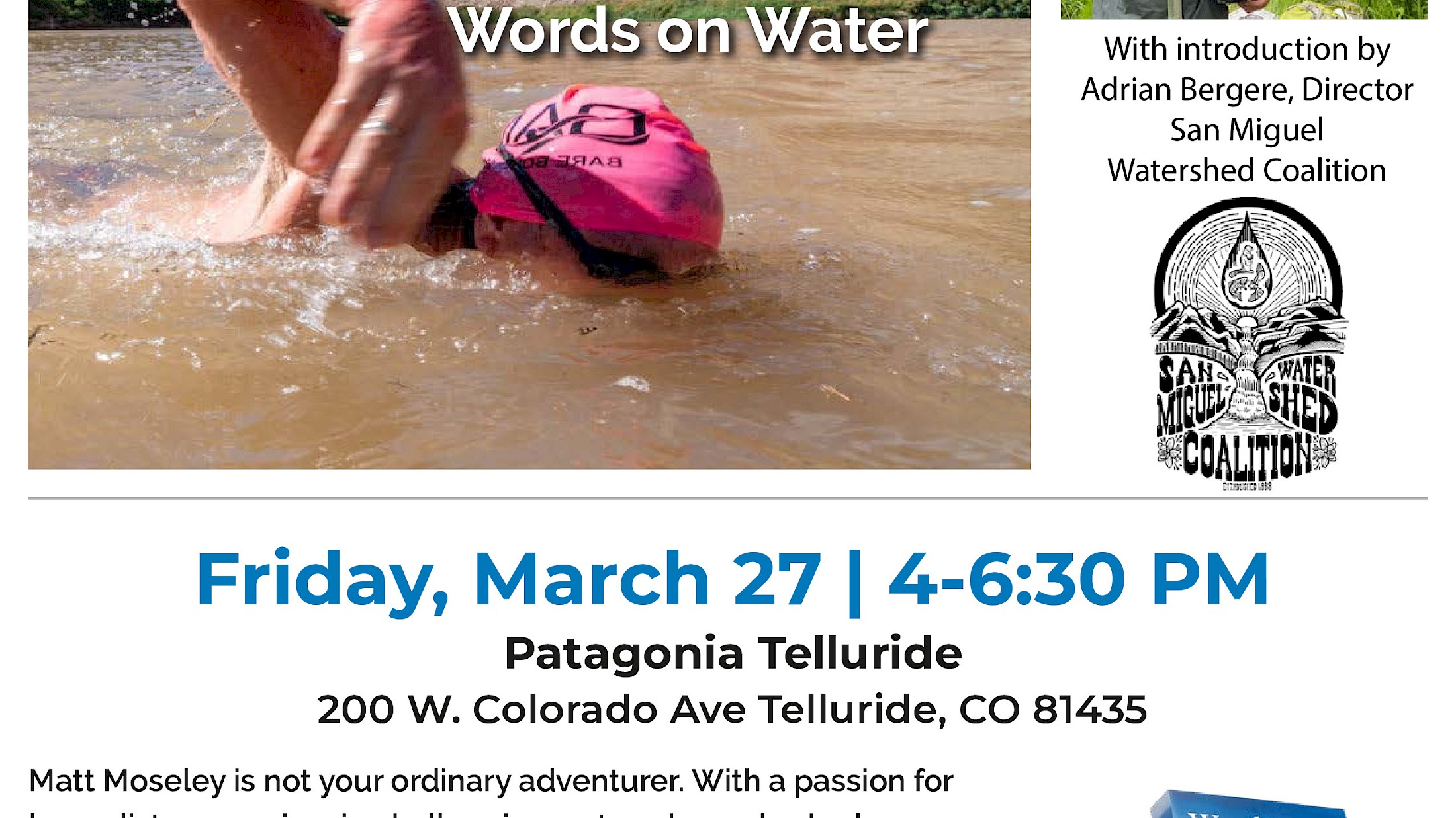 Matt Moseley will present his most recent book, "Words on Water". He will share tales of his epic swimming adventures, food and beverages will be served.