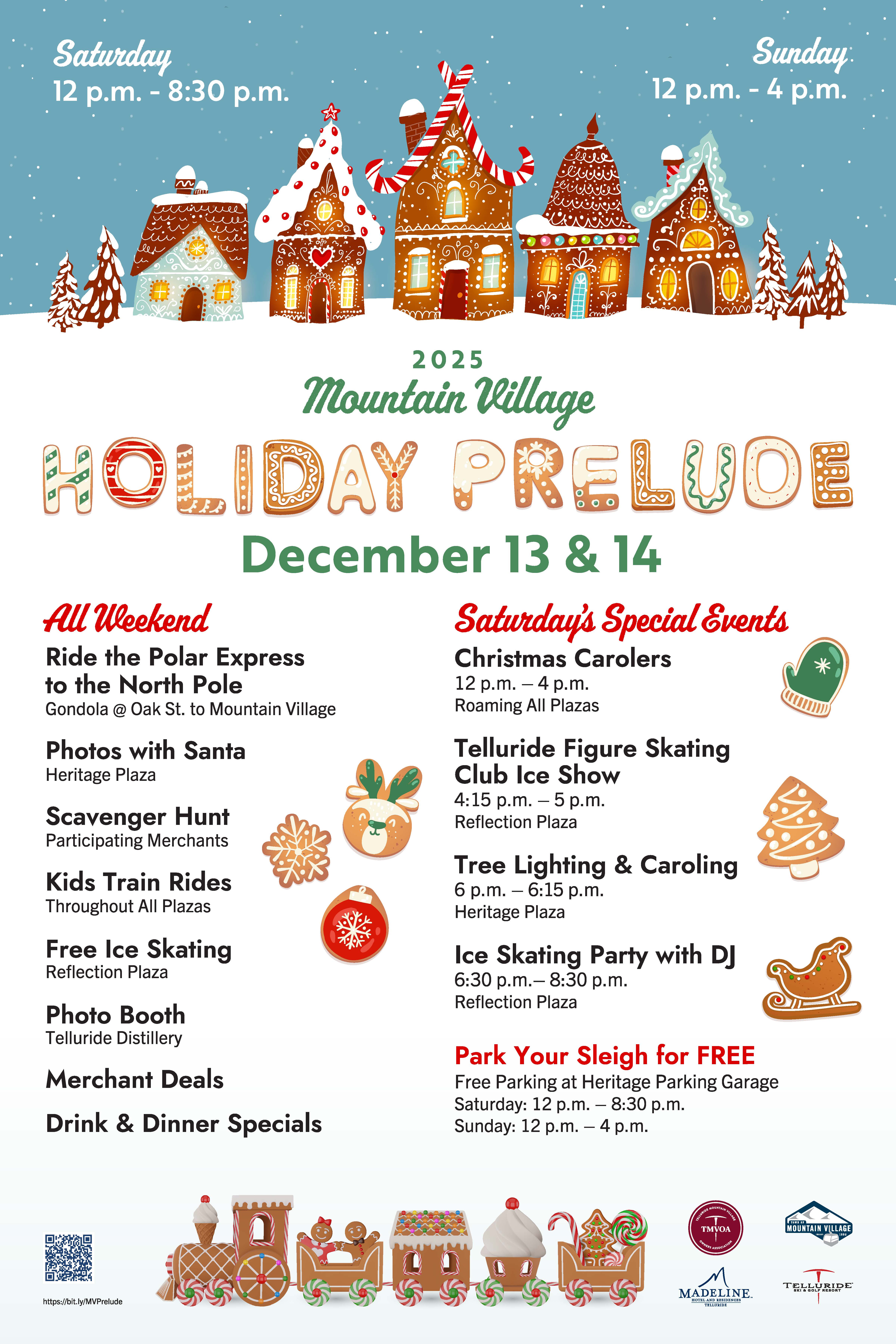 Mountain Village is being transformed once again into the North Pole for this year’s Holiday Prelude celebration on Saturday, Dec. 13 and Sunday, Dec. 14, 2025. This year promises a great kick-off to the holiday season with train rides, sitting with Santa, ice skating and children’s holiday surprises around every corner.