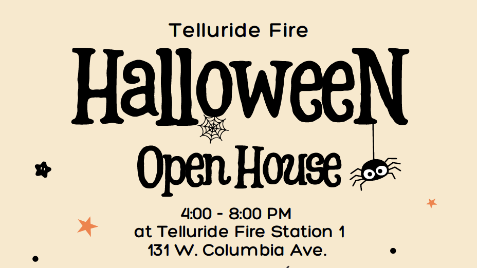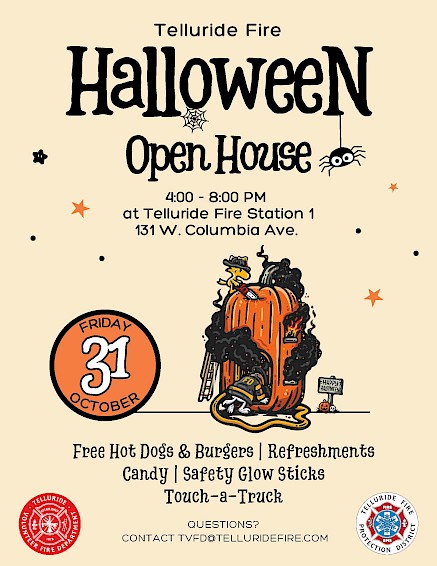 Telluride Fire invites the community to its Halloween Open House on Friday, October 31, from 4–8 p.m. at Telluride Fire Station 1. Stop by for free hot dogs, burgers, and refreshments, and pick up candy and safety glowsticks for trick-or-treating. It’s a fun, family-friendly way to celebrate Halloween and connect with your local firefighters!
