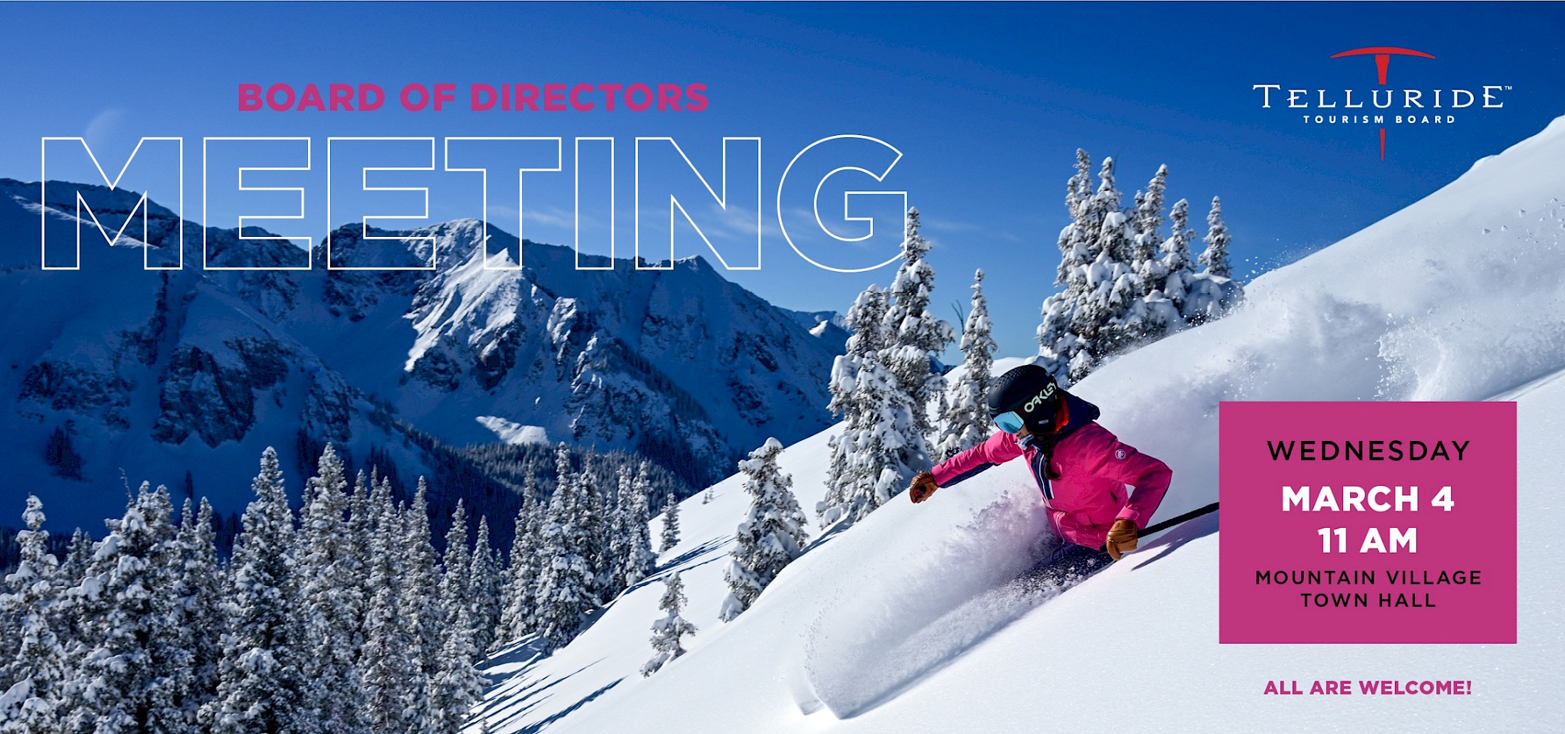 Join the Telluride Tourism Board for our quarterly Board of Directors Meeting at 11 a.m. on Wednesday, March 4 at the Mountain Village Town Hall.