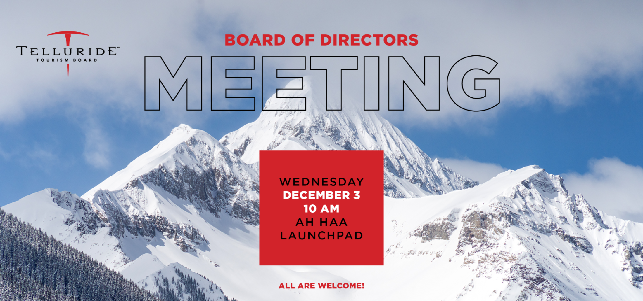 Join the Telluride Tourism Board for our quarterly Board of Directors Meeting at 10 a.m. on Wednesday, December 3 at the Ah Haa School for the Arts Launchpad.